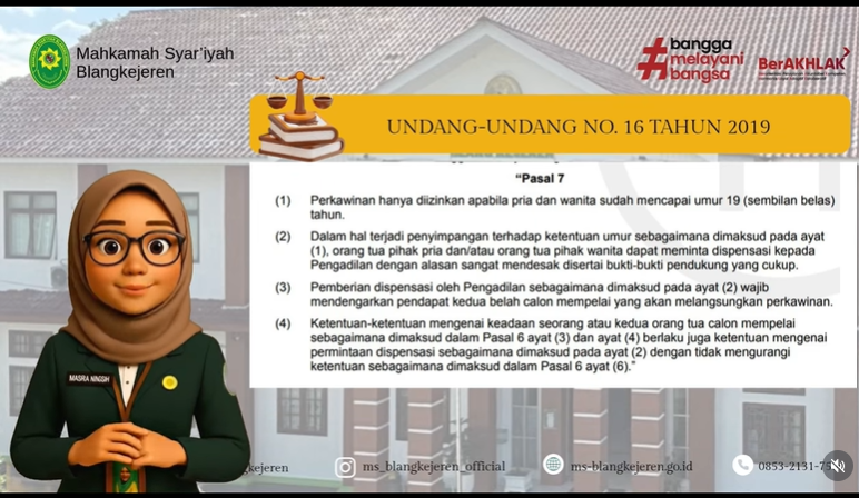Melalui video tersebut dijelaskan bahwa calon mempelai laki-laki maupun perempuan yang belum berusia 19 tahun wajib mengajukan Permohonan Dispensasi Kawin ke Mahkamah Syar’iyah Blangkejeren. Ketentuan ini harus dipenuhi agar pernikahan yang dilaksanakan sah secara hukum negara dan agama.