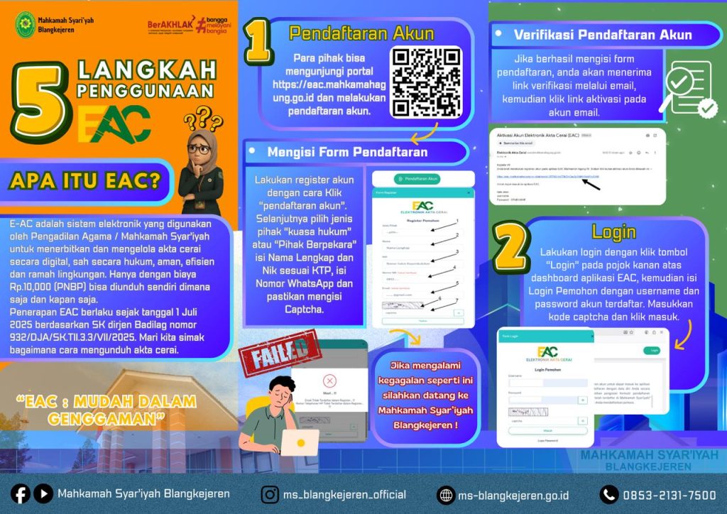 Dengan mengusung tagline “EAC: Mudah Dalam Genggaman”, Mahkamah Syar’iyah Blangkejeren berkomitmen memberikan pelayanan publik yang modern, transparan, dan berorientasi pada kebutuhan masyarakat.