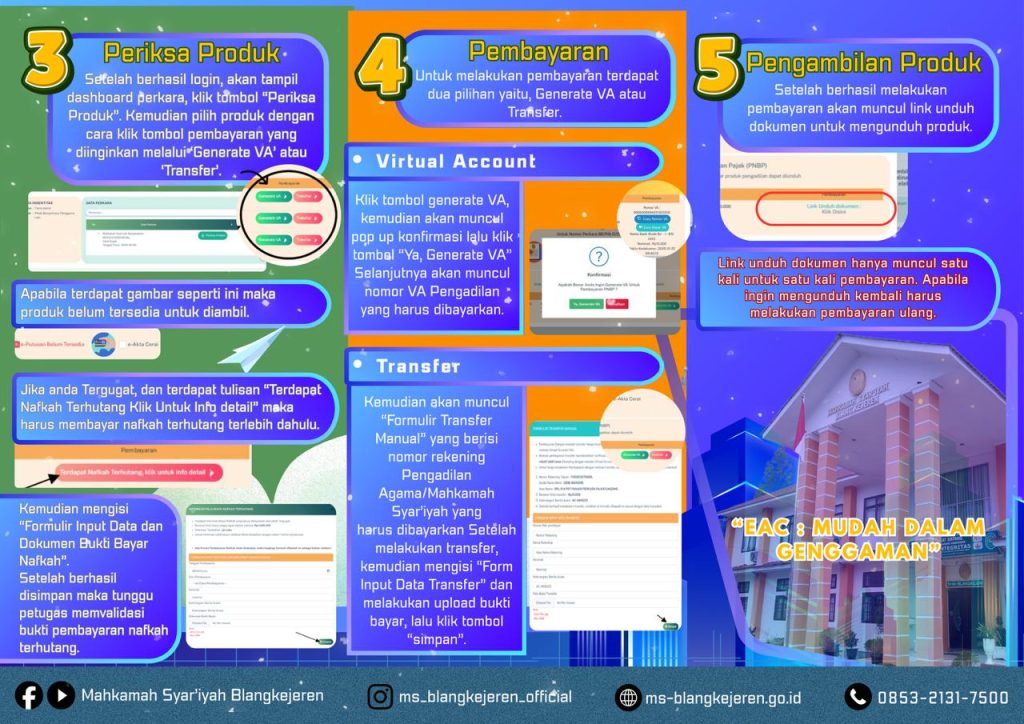 Bagi masyarakat yang membutuhkan pendampingan atau mengalami kendala dalam penggunaan E-AC, dapat langsung datang ke kantor Mahkamah Syar’iyah Blangkejeren atau menghubungi: