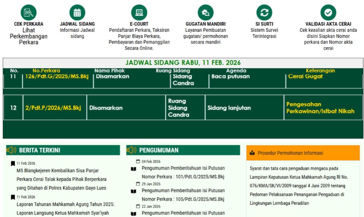 Blangkejeren, 11-02-2026 — Mahkamah Syar’iyah (MS) Blangkejeren pada hari ini menyidangkan sebanyak 12 perkara, yang terdiri dari 10 perkara perceraian dan 2 perkara permohonan pengesahan nikah (isbat nikah). Persidangan berlangsung tertib dan lancar sesuai dengan jadwal yang telah ditetapkan.