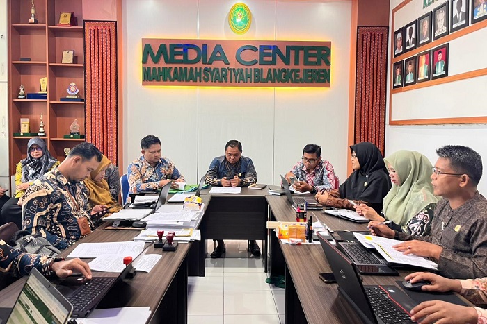 Mahkamah Syar’iyah Blangkejeren melaksanakan rapat evaluasi kinerja pada Jum’at, 6 Maret 2026, bertempat di Ruang Media Center MS Blangkejeren. Rapat dipimpin oleh Ketua MS Blangkejeren Taufik Rahayu Syam, S.H.I., M.S.I., serta diikuti oleh Wakil Ketua Gunawan, S.H.I., Hakim Alimal Yusro Siregar, S.H., Panitera, Sekretaris, pejabat struktural dan fungsional, serta seluruh aparatur MS Blangkejeren.